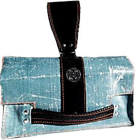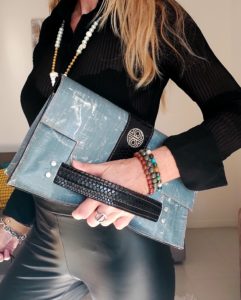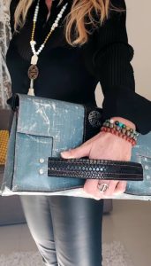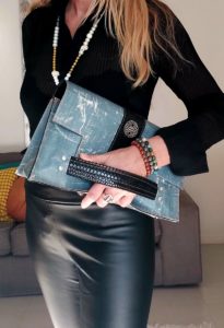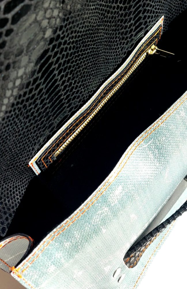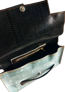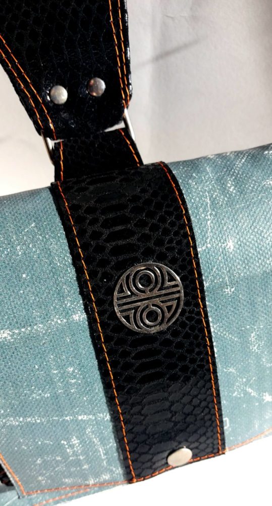 Nous vous proposons cette pièce unique l’AIXOIS en souvenir d’Aix en Provence la ville de ma jeunesse. Je l’ai confectionné  avec un cuir façon python et une bâche neuve mais façon jeans délavée. Il y a deux façons de se porter. La première ou j’ai créer un manchon en cuir pour glisser votre poigné pour un côté esthétique et novateur, la deuxième on glisse également sa main sur une bride de cuir douce et très agréable pour un côté chic et moderne. Le cuir est présent en totalité à l’intérieur du sac un rappel du cuir extérieur pour une uniformité plus noble.